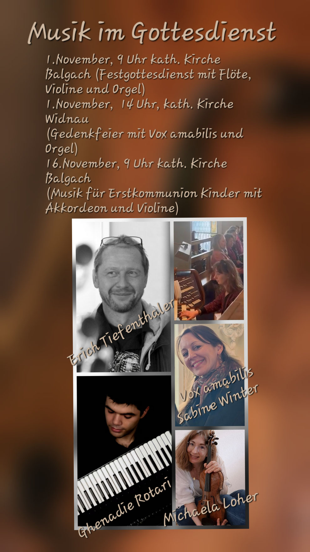 Sonntag, 9. November 2025, Gottesdienste: 9.00 Uhr, kath Kirche Balgach, 10.30 Uhr, kath. Kirche Widnau, Michaela Loher (Orgel)