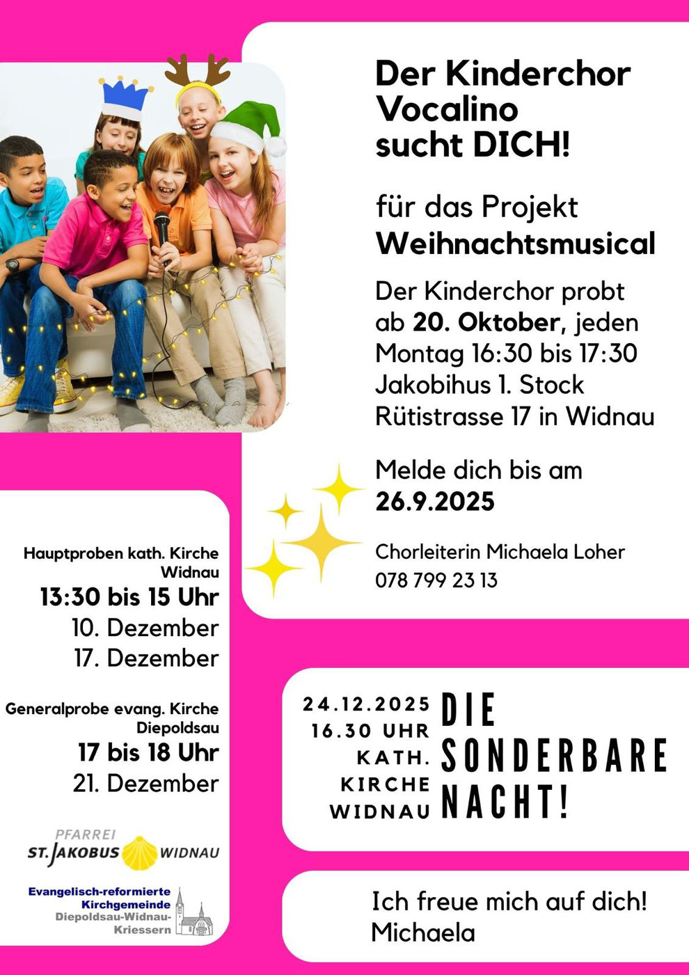 Kontakt: Michaela Loher, Chorleiterin, Tel mobil: 41 78 799 23 13, e-mail: loher.michaela@gmail.com